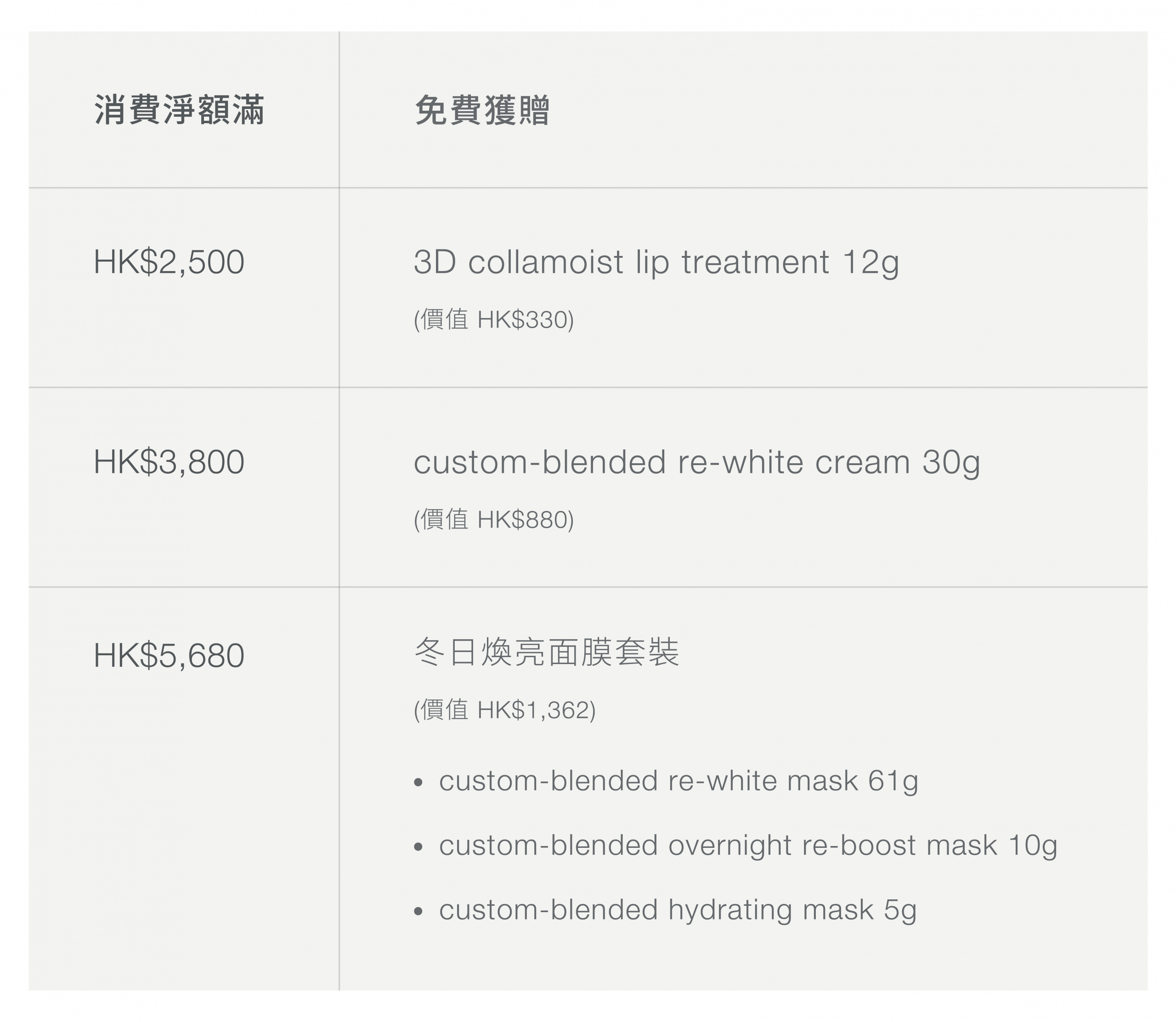 任何消費即可獲贈 custom-blended overnight re-boost mask 10g (價值 HK$189)。
