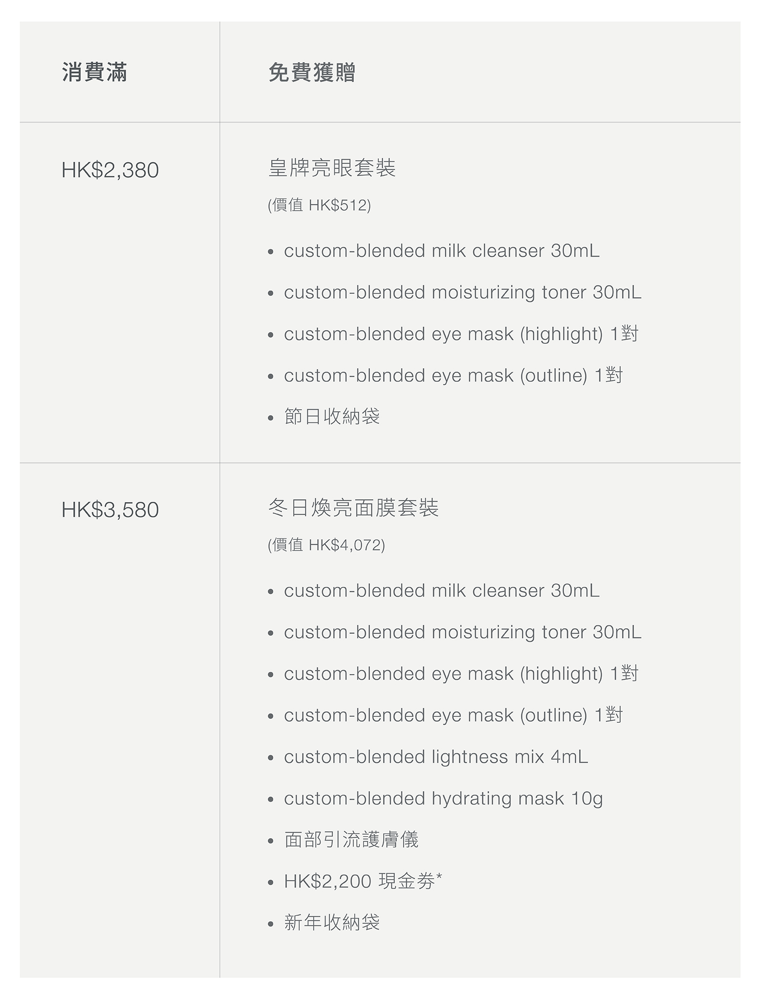 ^ HK$2,200 現金券包括 : HK$200 網店護膚產品現金券 | HK$500 門店護膚產品現金券 | HK$500 面部護理現金券 | HK$500 水療服務現金券 | HK$500 醫學美容療程現金券。每位客戶只可獲享 HK$2,200 現金券一次,現金券將於訂單確認後 7 個工作天內經電郵發出。